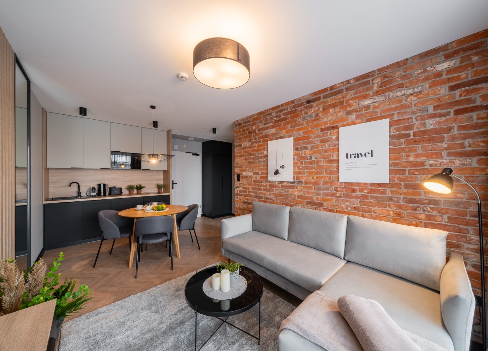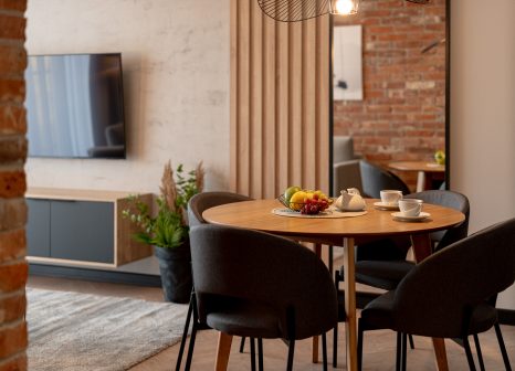 Das Interieur besticht durch seinen industriellen Charakter, der durch eine Wand aus authentischem rotem Backstein und Betonoberflächen an den Wänden unterstrichen wird. Modernen Schick verleihen Eichenlamellen und Designerbeleuchtung – darunter eine einzigartige Leuchte über dem Esstisch in offener Konstruktion. Dank großer Verglasungen und der Lage im dritten Stock ist das Apartment hervorragend belichtet, und der private Balkon ermöglicht es Ihnen, die frische Meeresluft zu genießen.