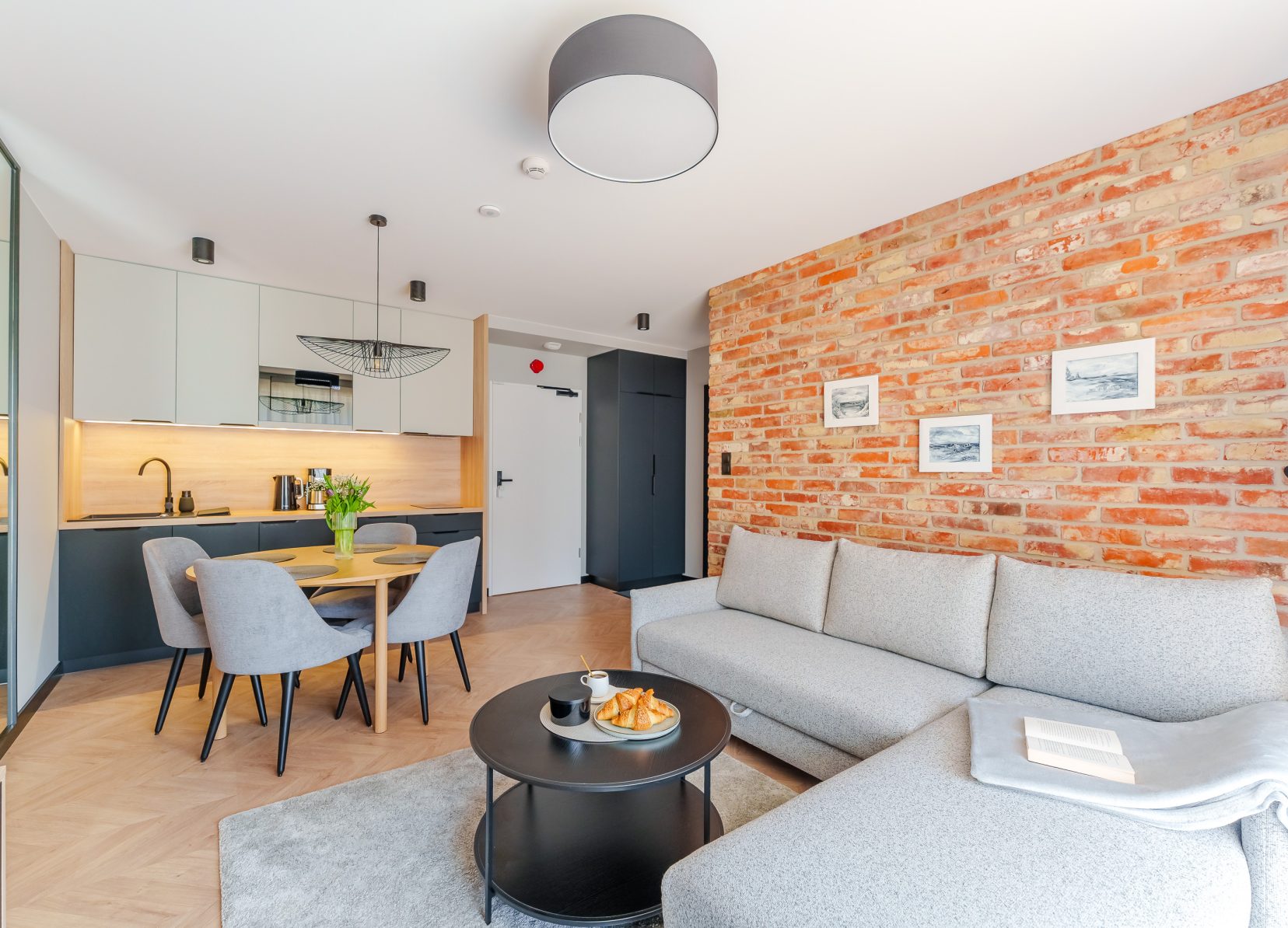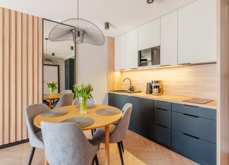 Kochnische: Elegante Einbaumöbel, die mattes Schwarz mit Eichen-Finish kombinieren. Zur Verfügung stehen: Induktionskochfeld, eingebaute Mikrowelle, Geschirrspüler, Filterkaffeemaschine, Wasserkocher sowie ein komplettes Set an Geschirr. An der Kochnische befindet sich ein runder Tisch mit vier bequemen, gepolsterten Stühlen.