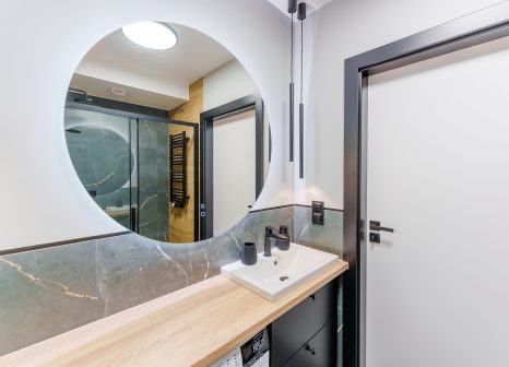 Badezimmer: Modernes Design basierend auf Beton- und Holzmotiven. Eine Walk-In-Dusche mit Regendekoration, ein Aufsatzwaschbecken, ein großer beleuchteter Spiegel sowie eine eingebaute Waschmaschine bieten höchsten Komfortstandard.